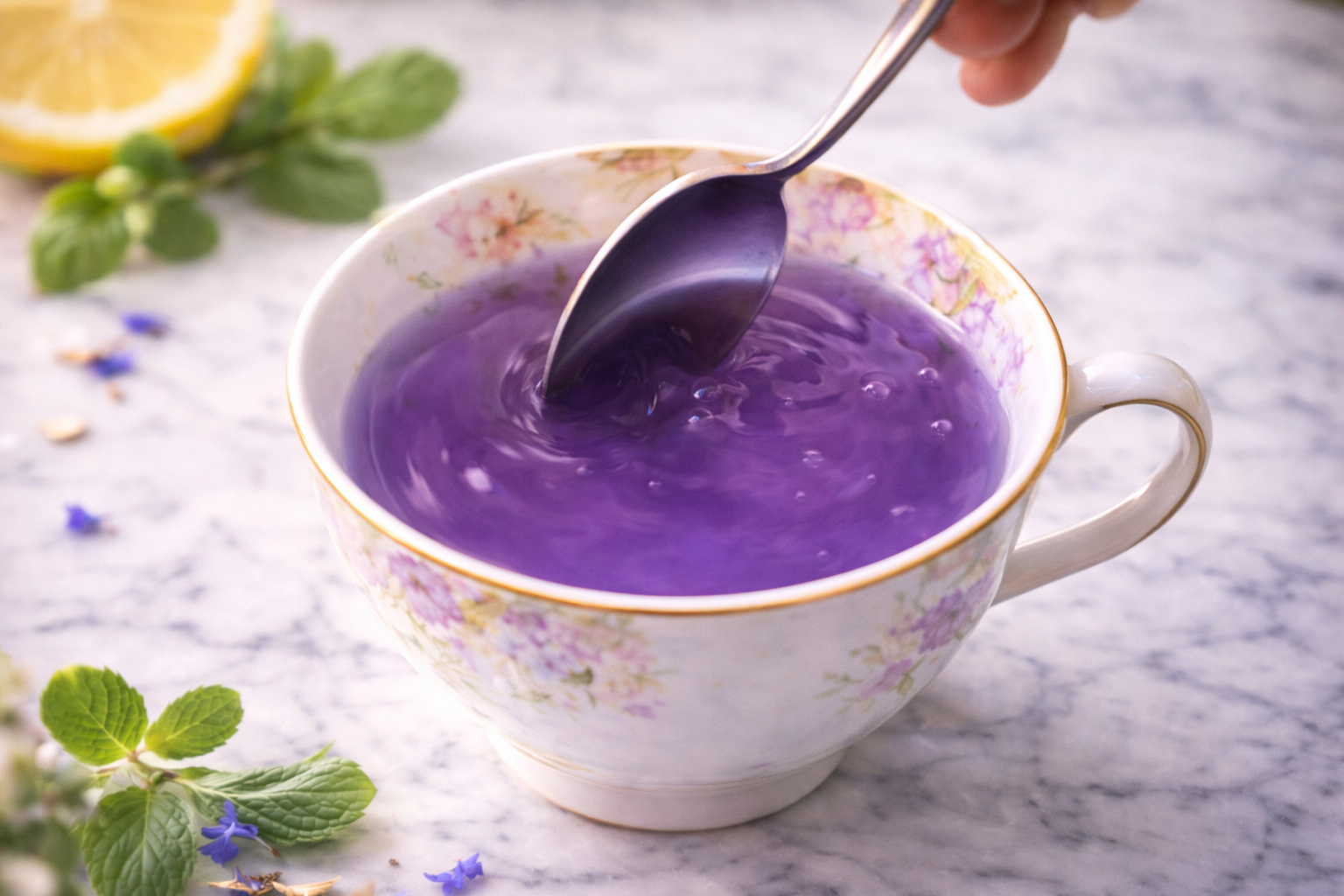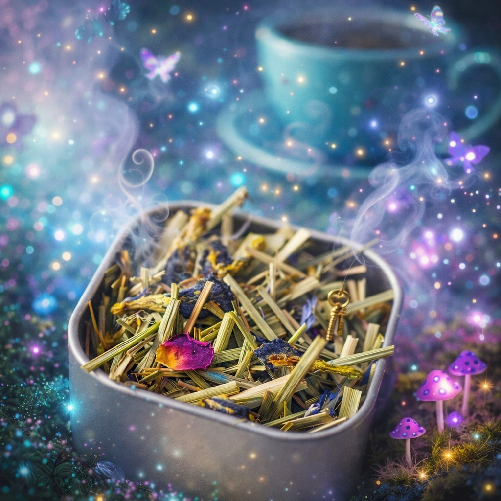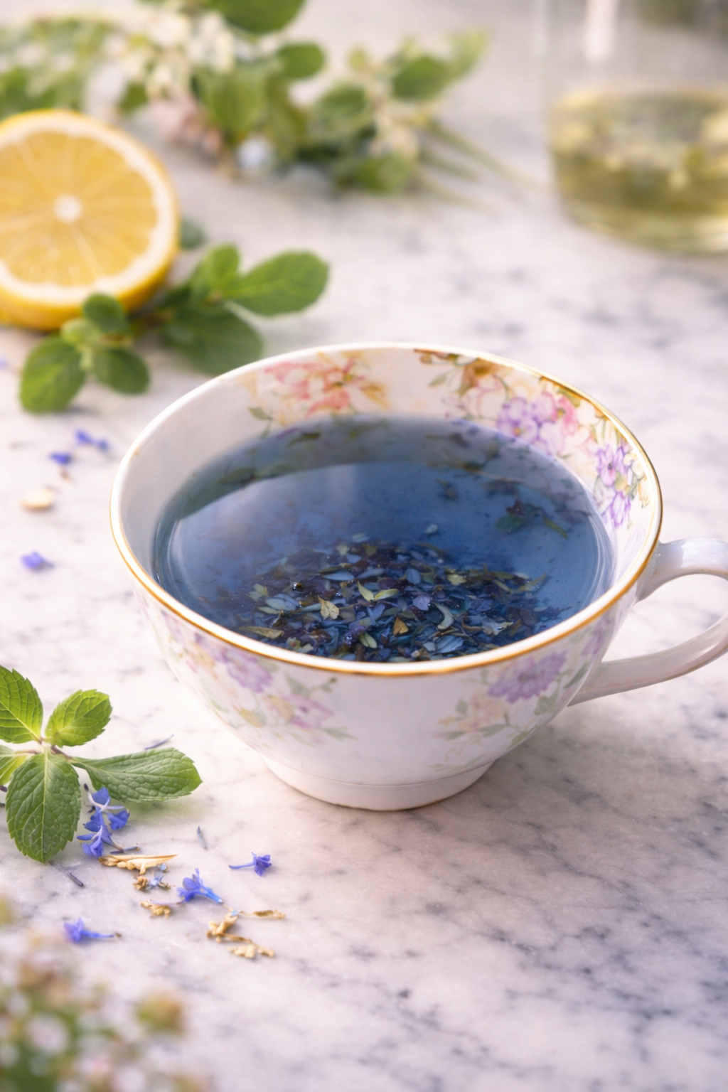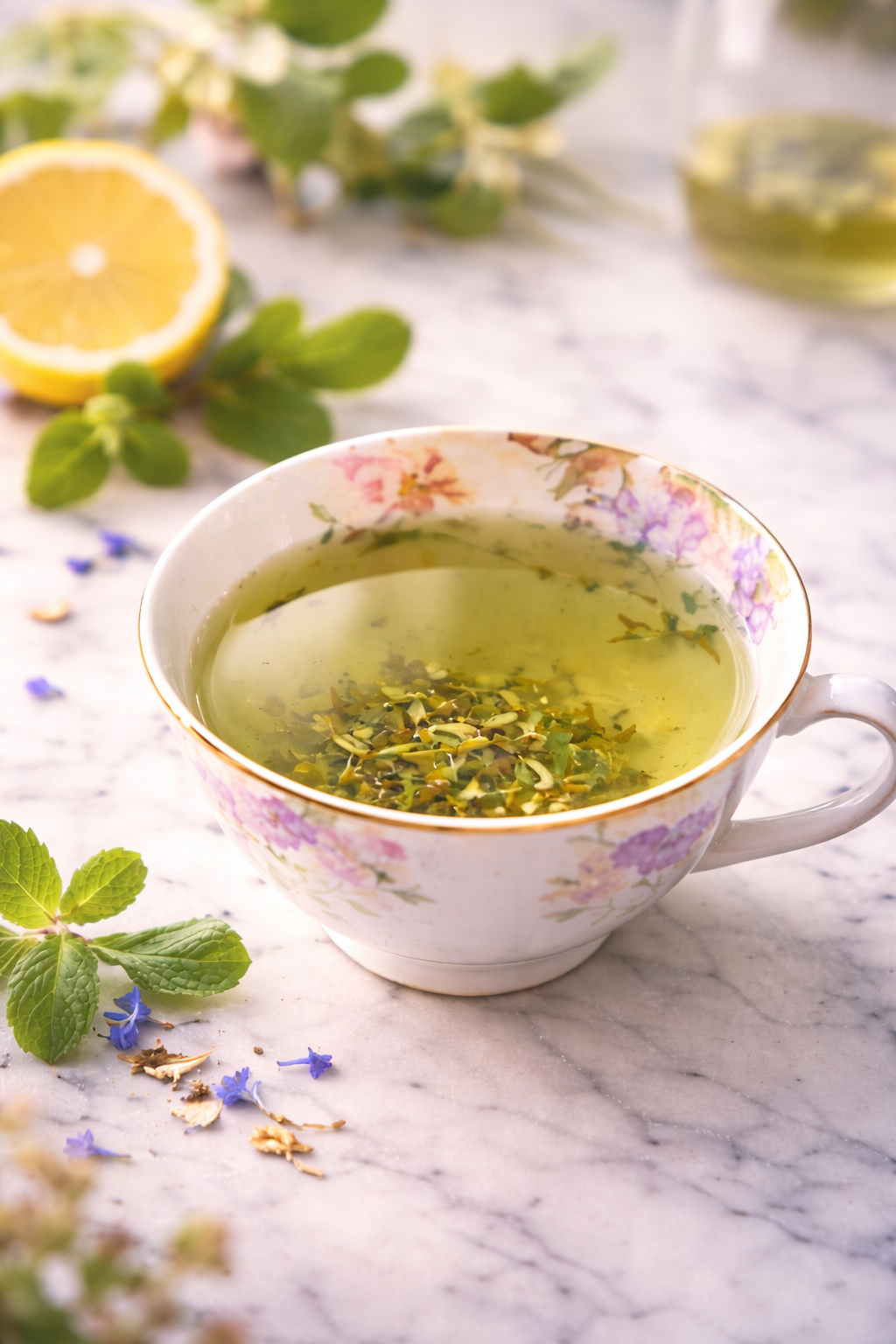 A soft green herbal infusion, grounded and gentle,